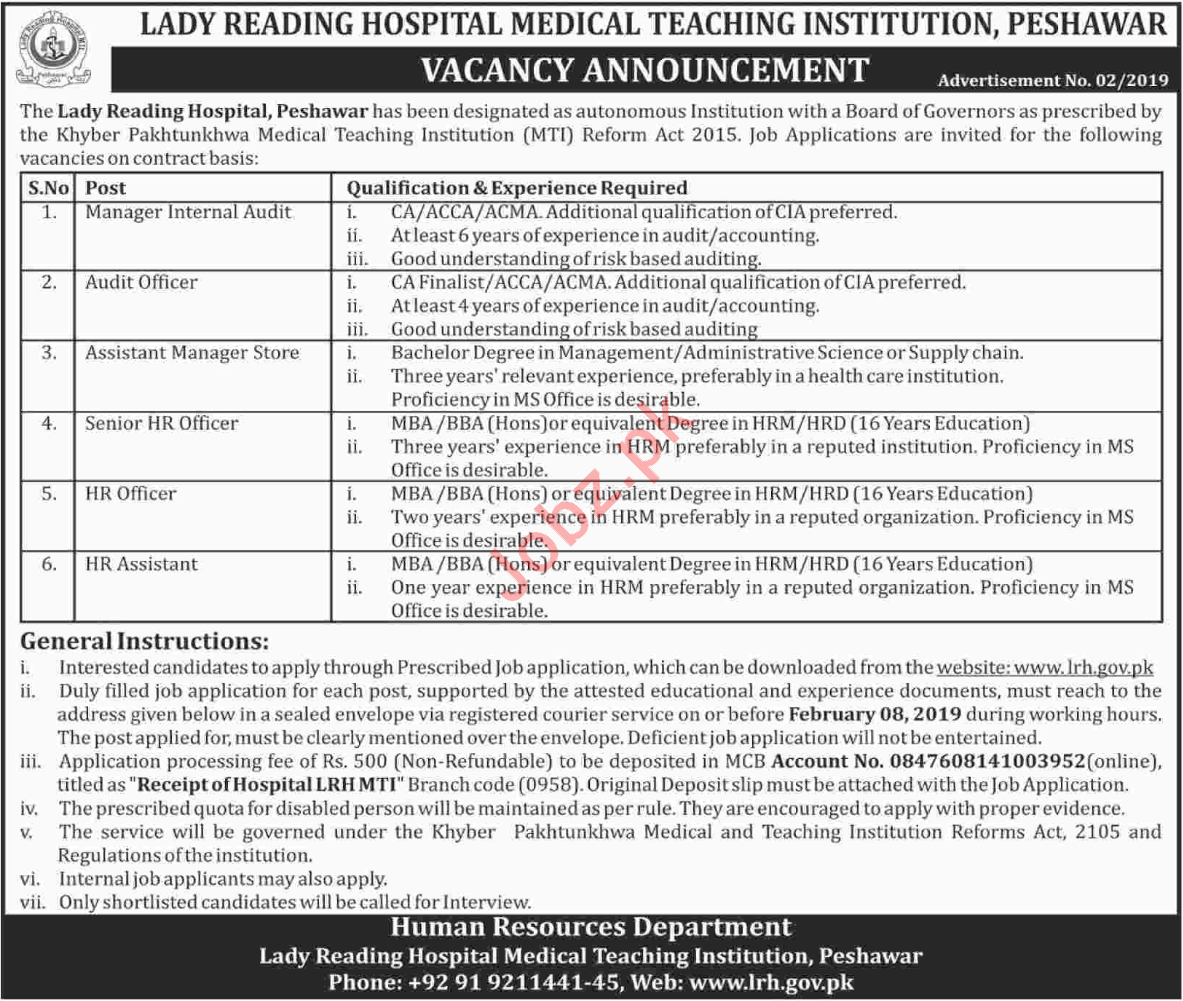 The Lady Reading Hospital LRH Medical Teaching Institution MTI invites applications from highly qualified and well educated individuals for the posts of Manager Internal Audit, Audit Officer, Assistant Manager Store, HR Officer, HR Assistant in Peshawar KPK 2019.