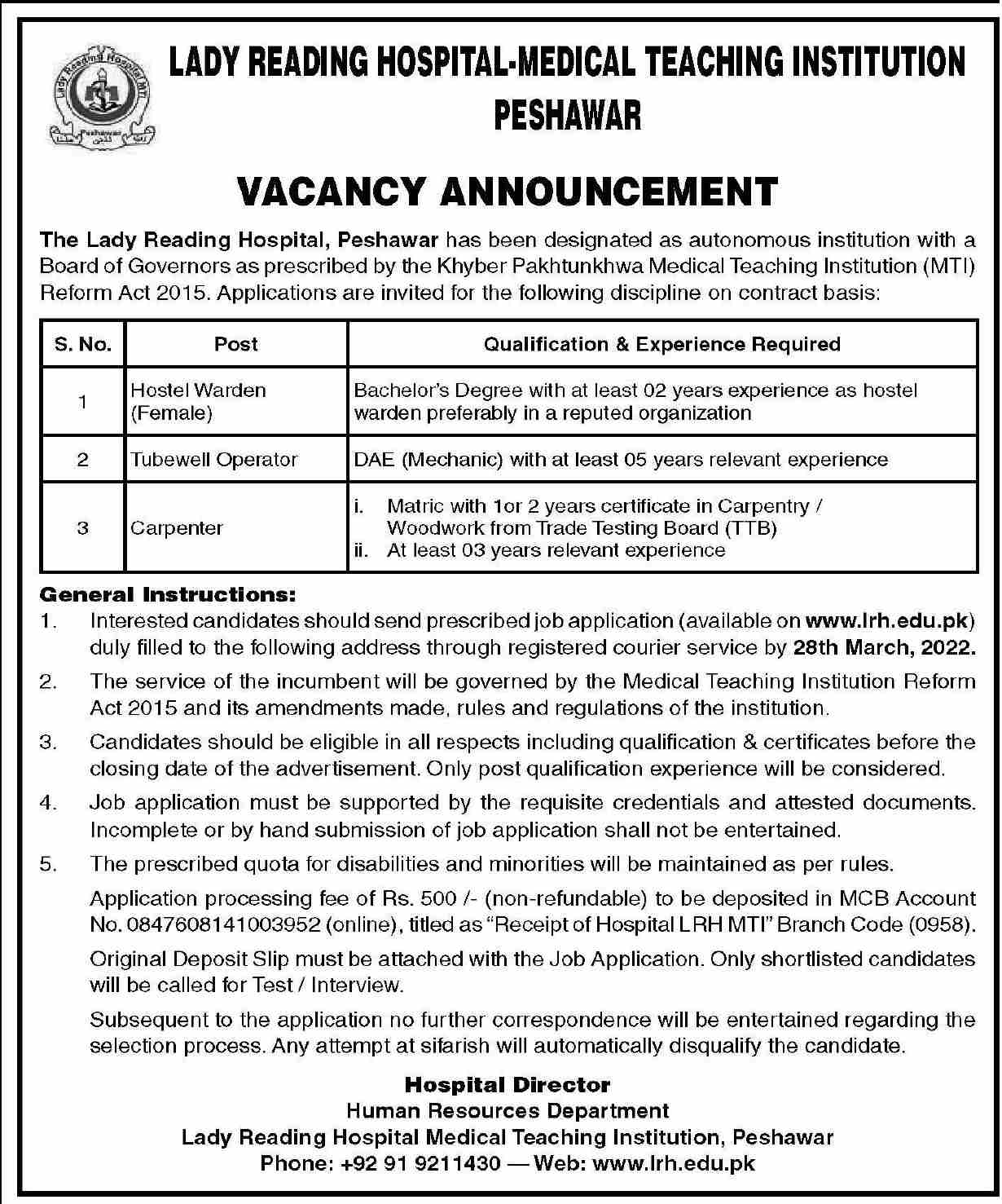 Lady Reading Hospital Peshawar, peshawar Khyber Pakhtunkhwa KPK Pakistan invites applications from eligible candidates for the post of hostel warden, tubewell operator and carpenter as per advertisement of March 12, 2022 published in daily Dawn Newspaper. Educational qualifications required DAE, Bachelor and Matric etc.
