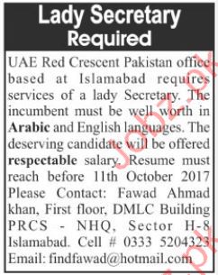 Lady Secretary In UAE Red Crescent Pakistan Job 2017