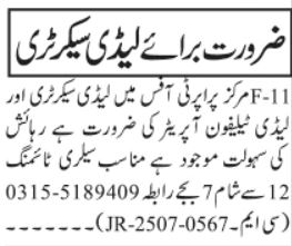 Property Office F-11 Markaz Islamabad, islamabad Islamabad Pakistan invites applications from eligible candidates for the post of lady secretary, lady telephone operator, secretary and telephone operator as per advertisement of July 19, 2025 published in daily Jang Newspaper. BA, Intermediate and Bachelor etc. educational qualification will be preferred.