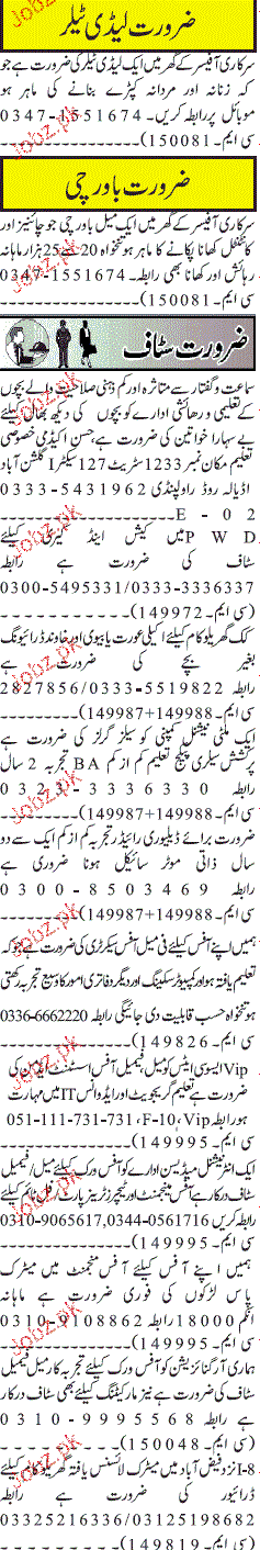 Lady Tailors, Cook, Drivers, Sales Girls Job Opportunity