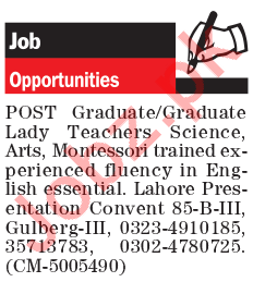Lady Teachers, Montessori Teachers & Subject Teachers Jobs