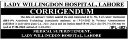 Lady Willingdon Hospital Lahore, lahore Punjab Pakistan invites applications from eligible candidates for the post of technician, anesthesia technology and anesthesia assistant as per advertisement of January 13, 2023 published in daily Nation Newspaper. Persons with Intermediate and Matric etc. education can apply.