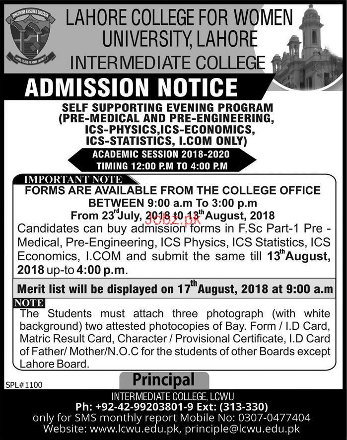 Lahore College For Women University Lahore Intermediate College Admission in FSc Pre Medical, Pre Engineering, ICs Computer Sciences and FA Humanities Group in Lhaore. Read newspaper ad for exact details.