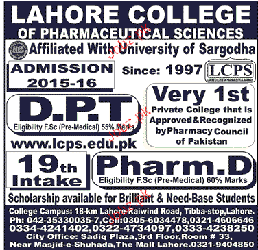 Lahore College of Pharmaceutical Sciences Admission in DPT in Lahore. Read newspaper ad for exact details.