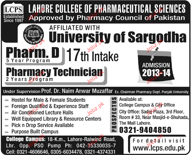 Lahore College of Pharmaceutical Sciences Admission in Pharm-D in Lahore Read newspaper ad for exact details.