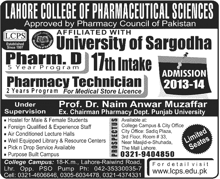 Lahore College of Pharmaceutical Sciences Admission in Pharm-D in Lahore Read newspaper ad for exact details.