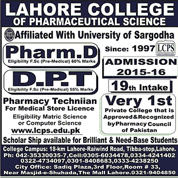 Lahore College of Pharmaceutical Sciences Admission in Pharm-D and DPT in Lahore. Read newspaper ad for exact details.