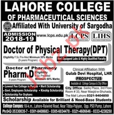 Lahore College of Pharmaceutical Sciences LCPS Lahore, Pakistan are opened admissions fall 2018 for the classes of DPT (Doctor of Physical Therapy) and Pharm D. Read newspaper ad for exact details.
