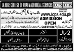 Lahore College of Pharmaceutical Sciences LCPS Paramedical Course 2 Years, Dispenser, Operation Theatre Technician, Radiology & Imaging Technician, Medical Lab Technician. admissions 2022 has been announced. Students can enroll for admissions in Lahore College of Pharmaceutical Sciences LCPS Lahore Punjab Pakistan for academic year 2022 to continue campus based or online education in Medical Diploma. Students who want to enroll for academic session 2022 in Course qualification and admission criteria for Private institute can apply till last date 15 September 2022. Read newspaper ad for exact details.