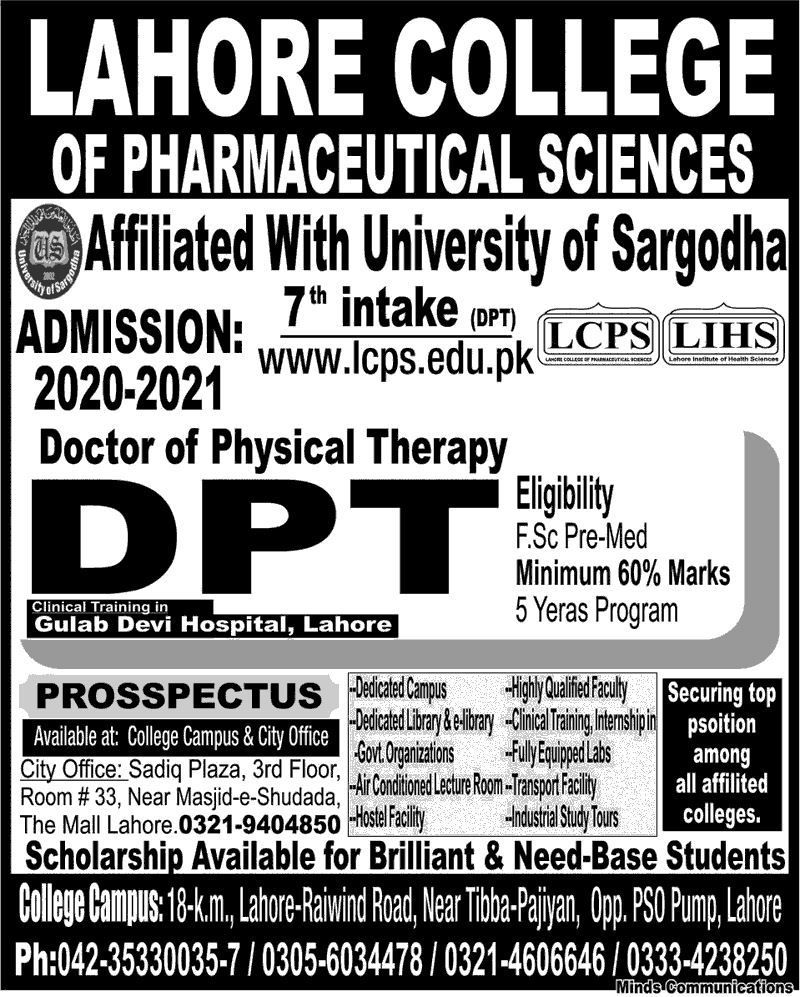 Lahore College of Pharmaceutical Sciences LCPS affiliated with University of Sargodha invited application for admission in Doctor of Physical Therapy DPT 5 Years Program. Read newspaper ad for exact details.