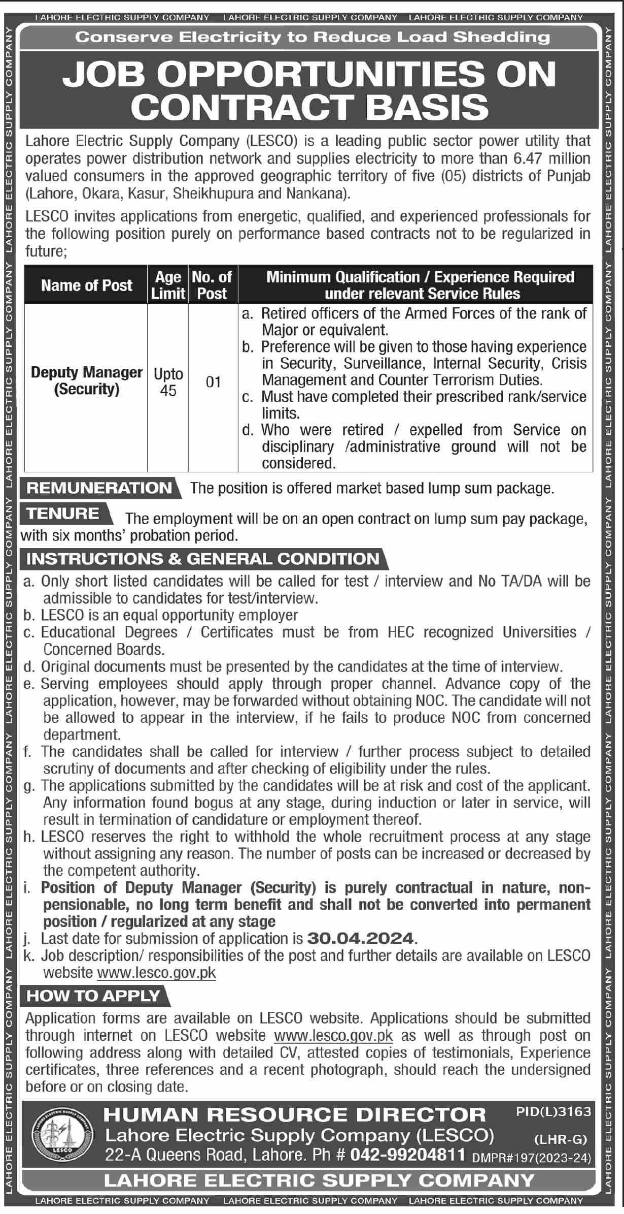 Lahore Electric Supply Company LESCO Lahore, lahore Punjab Pakistan invites applications from eligible candidates for the post of deputy manager security as per advertisement of April 14, 2024 published in daily Jang Newspaper. Candidates with Intermediate etc. educational background will be preferred.