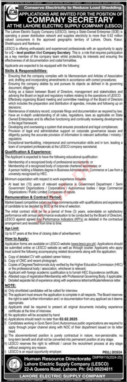 Vacant posts including company secretary are announced in Lahore Electric Supply Company LESCO Lahore, lahore Punjab Pakistan as per 19 January 2025 advertisement in daily The News Newspaper. Candidates with Master, MS and Bachelor etc. educational background will be preferred.