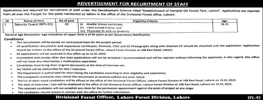 Lahore Forest Division Jobs 2025 For Security Guard