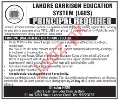 Lahore Garrison Education System LGES Principal Jobs 2019