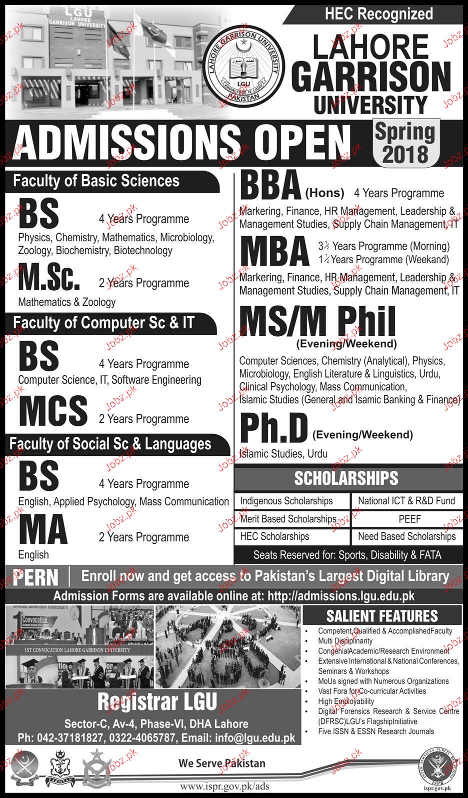 Lahore Garrison University Admission in BS, BBA, MSc, MBA, MS, MCs, BS, MA and PHD in Lahore. Admission Forms are available online at http://admission.lgu.edu.pk Read newspaper ad for exact details.