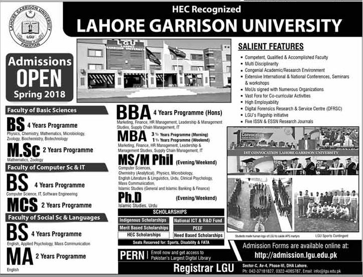 HEC Recognized Lahore Garrison University is offering admissions in different fields such as BS, BBA, MBA, MSc, MS/M.Phil, BS, MCS, PhD, BS, MA. Candidates should apply through proper channel. Read newspaper ad for exact details.