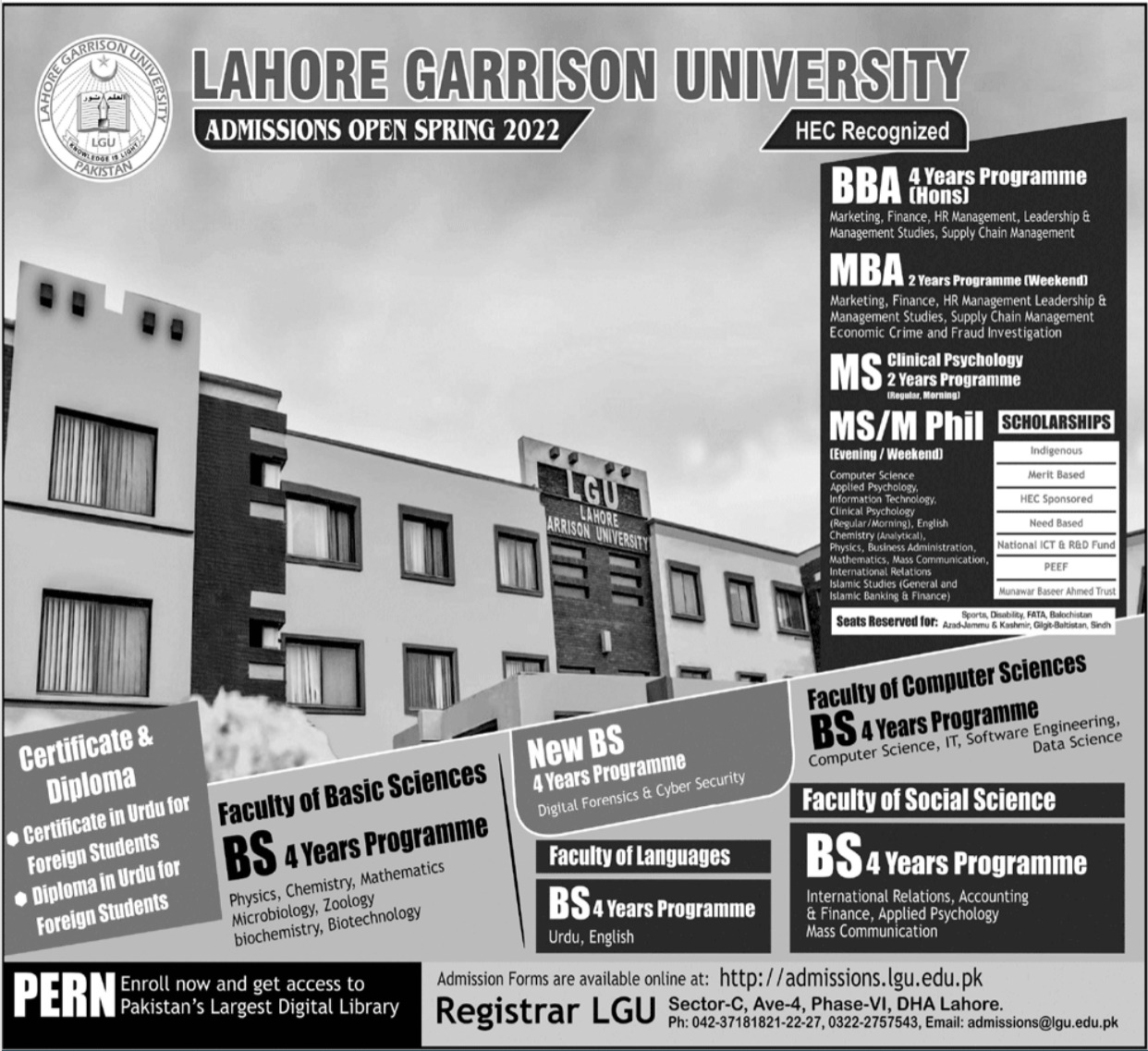 Admissions in Lahore Garrison University 2022 for BS, BBA, MBA< MS, M.Phil has been announced. Lahore Garrison University Lahore Punjab Pakistan welcomes students to apply for admissions in academic year 2022 in Other University. Eligible students for fulfilling criteria for admissions in MBA, Mphil, BS and BBA can enroll as per Government admission policy 2022 till closing date 6 March 2022. Read newspaper ad for exact details.