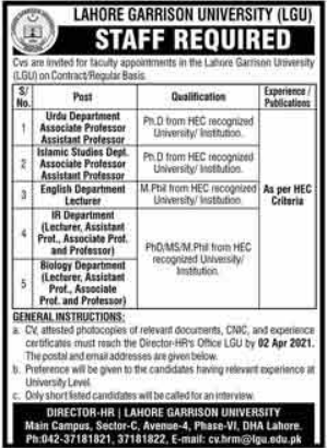 Vacancies in Lahore Garrison University Advertisement March 2021