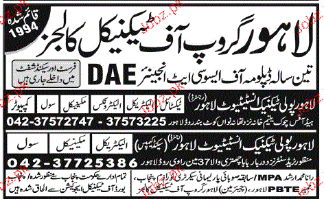 Lahore Group of Technical Colleges Admission in DAE in Textile, Electrical, Mechancial, Civil and Computer in Lahore Read newspaper ad for exact details.