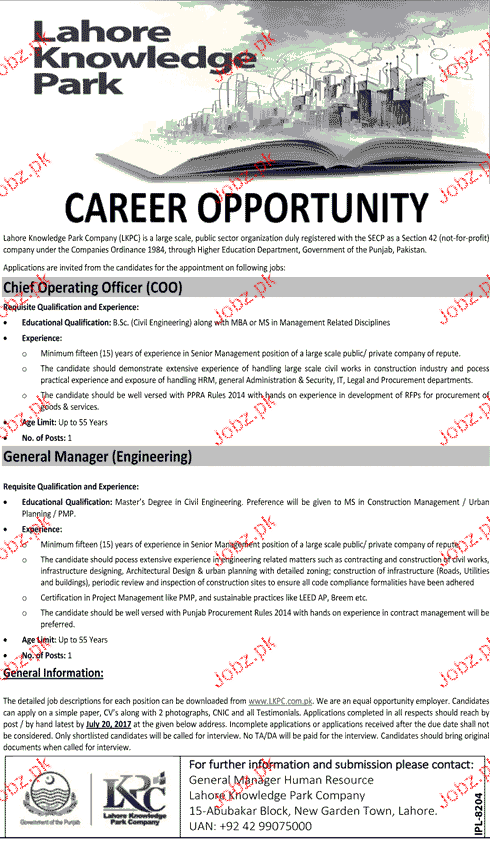 Apply as per details in job advertisement. Login to view further details of how to apply via https://www.jobz.pk online.