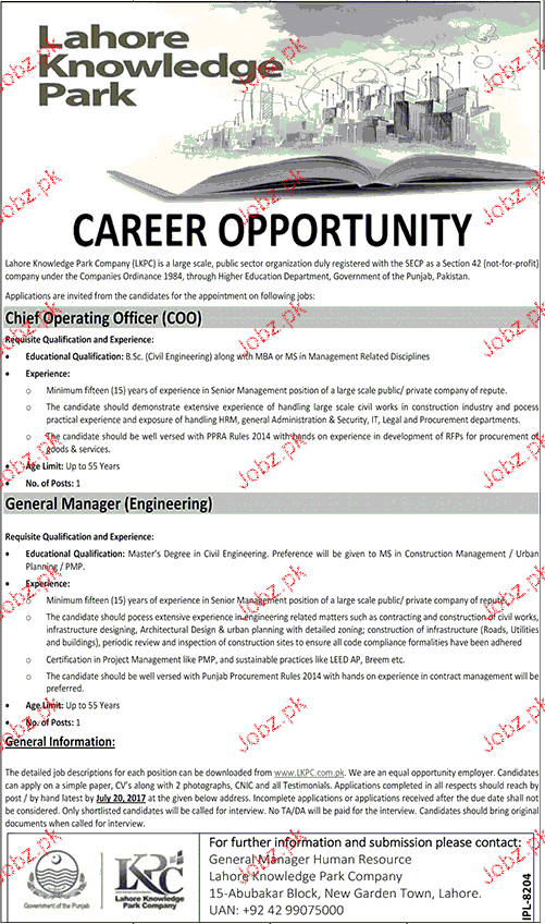 Apply as per details in job advertisement. Login to view further details of how to apply via https://www.jobz.pk online.