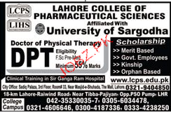 Lahore Lahore College of Pharmaceutical Sciences Affiliated with university of Sargodha Admission in DPT Doctor of Physical Therapy in Lahore. Scholarship Available. Read newspaper ad for exact details.
