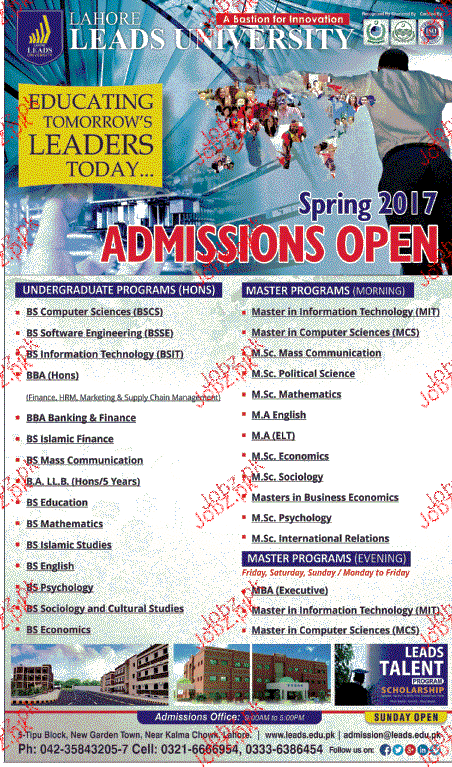 Lahore Leads University Admission in BS, BBA, BS and LLB in Lahore. Read newspaper ad for exact details.