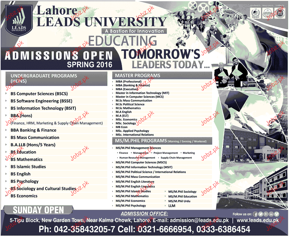 Lahore Leads University Admission in BS, MBA, BBA and MA in Lahore. Read newspaper ad for exact details.