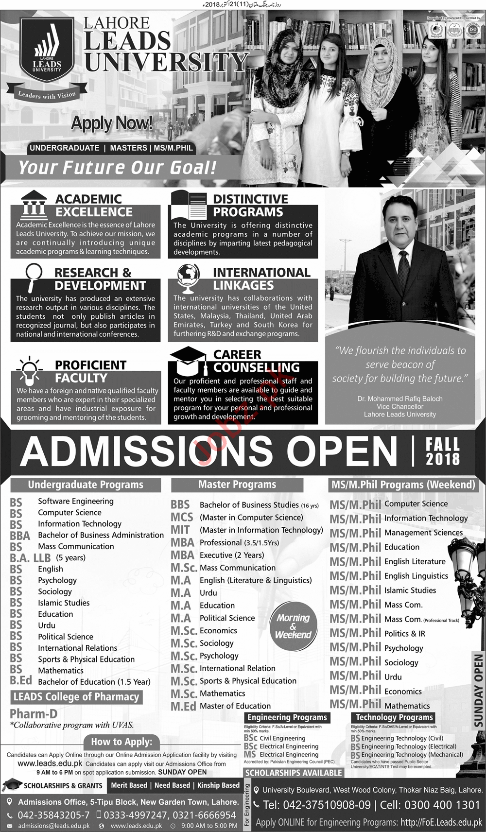 Lahore Leads University Lahore, Pakistan are announced admissions fall 2018 for the classes of BA, BA Hons, MA, MSc, MBA, BBA, MBF, B Com, BS, M Phil and PhD. Read newspaper ad for exact details.