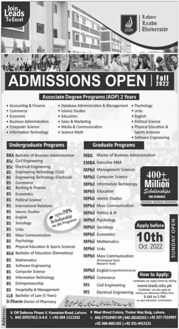 Lahore Leads University admissions 2022 for Associate Degree Programs in Accounting and Finance, Commerce, Economics, Business Administration, Computer Science, Information Technology. BS in Business Administration, BBA, Civil Engineering, Electrical Engineering, Engineering Technology, Commerce, Political Science, International Relations, English, Sociology, Urdu, Mass Communication, Psychology, Mathematics, Psychology. has been announced. Eligible students can apply for academic admissions 2022 in Lahore Leads University Lahore Punjab Pakistan for Teaching University. Eligible candidates for admissions in MS, Master, BS, Bachelor, ADP and Mphil can apply as per Private institute criteria and before closing date 10 October 2022 after reading advertisement online. Read newspaper ad for exact details.