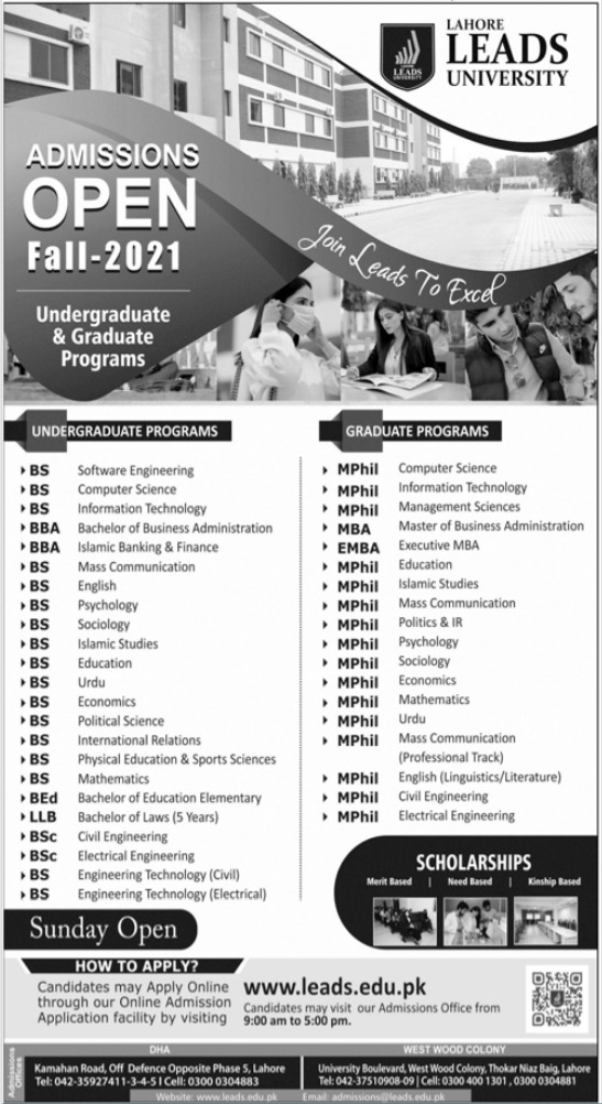 Lahore Leads University is a private sector university has announced admissions in BS, BBA, B.Ed, LLB, BSc, M.Phil, MBA and EMBA degree programs 2021. Read newspaper ad for exact details.
