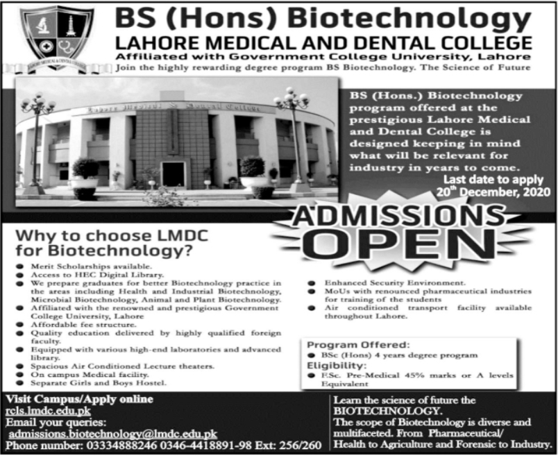 Lahore Medical & Dental College affiliated with Government College University Lahore has announced online admissions in BS Hons Biotechnology in Lahore. Read newspaper ad for exact details.
