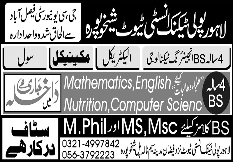 Lahore Polytechnic Institute has announced admissions for BS Engineering Technology in Electrical, Mechanical and Civil in Sheikhupura Punjab Pakistan 2021. Read newspaper ad for exact details.