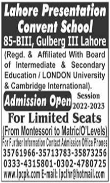 Admissions in Lahore Presentation Convent School 2022 for Admission are open in Faculty of Science Pre-Medical Pre-Engineering. has been announced. Lahore Presentation Convent School Lahore Punjab Pakistan welcomes students to apply for admissions in academic year 2022 in Teaching School. Students for admissions in Intermediate can apply for online or campus classes as per Private institute criteria till admission closing date September 30, 2022. Read newspaper ad for exact details.