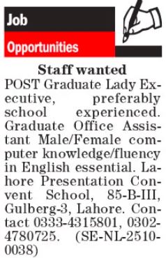 Apply at Lahore Presentation Convent School latest Classifieds jobs in Executive and departments before closing date which is around October 25, 2025 or as per closing date in newspaper ad. Read complete ad online to know how to apply on latest Lahore Presentation Convent School job opportunities.