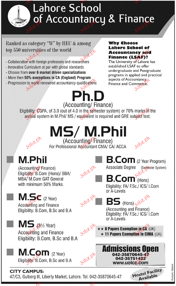 Lahore School of Accountancy & Finance Admission in MS, MSc, MCom, BS, Mphill and Phd in Lahore Read newspaper ad for exact details.