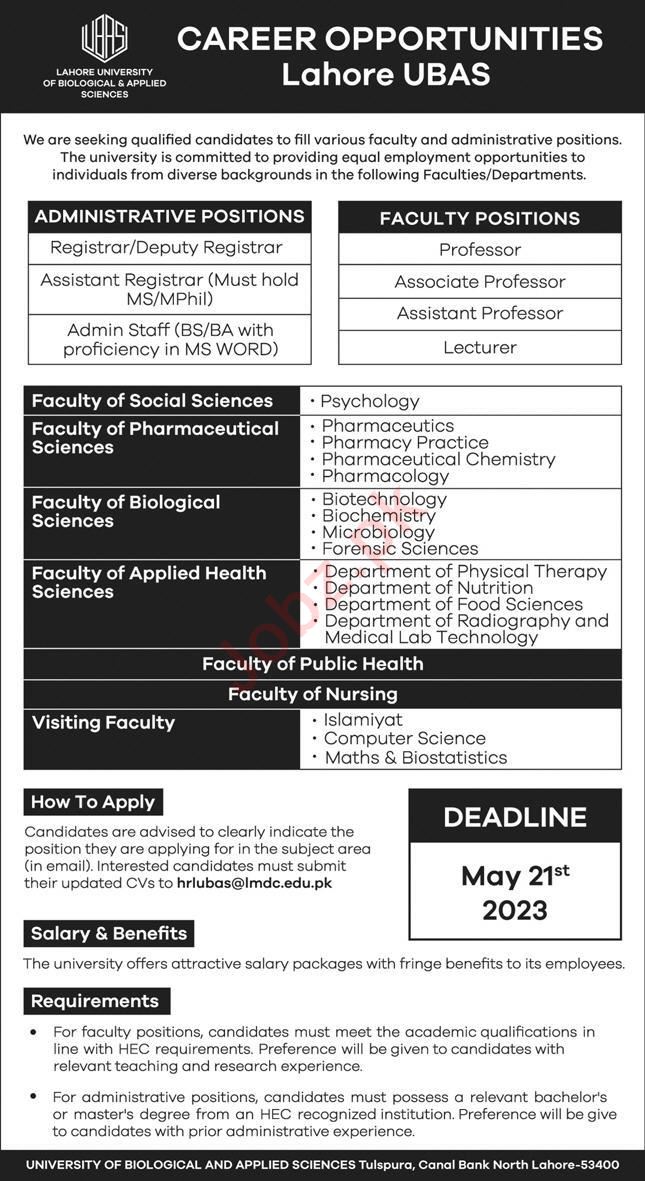 Lahore University of Biological & Applied LUBAS invites applications for job positions advertised in daily Express dated 30 April 2023 for following vacancies in Lahore, lahore Punjab Pakistan.