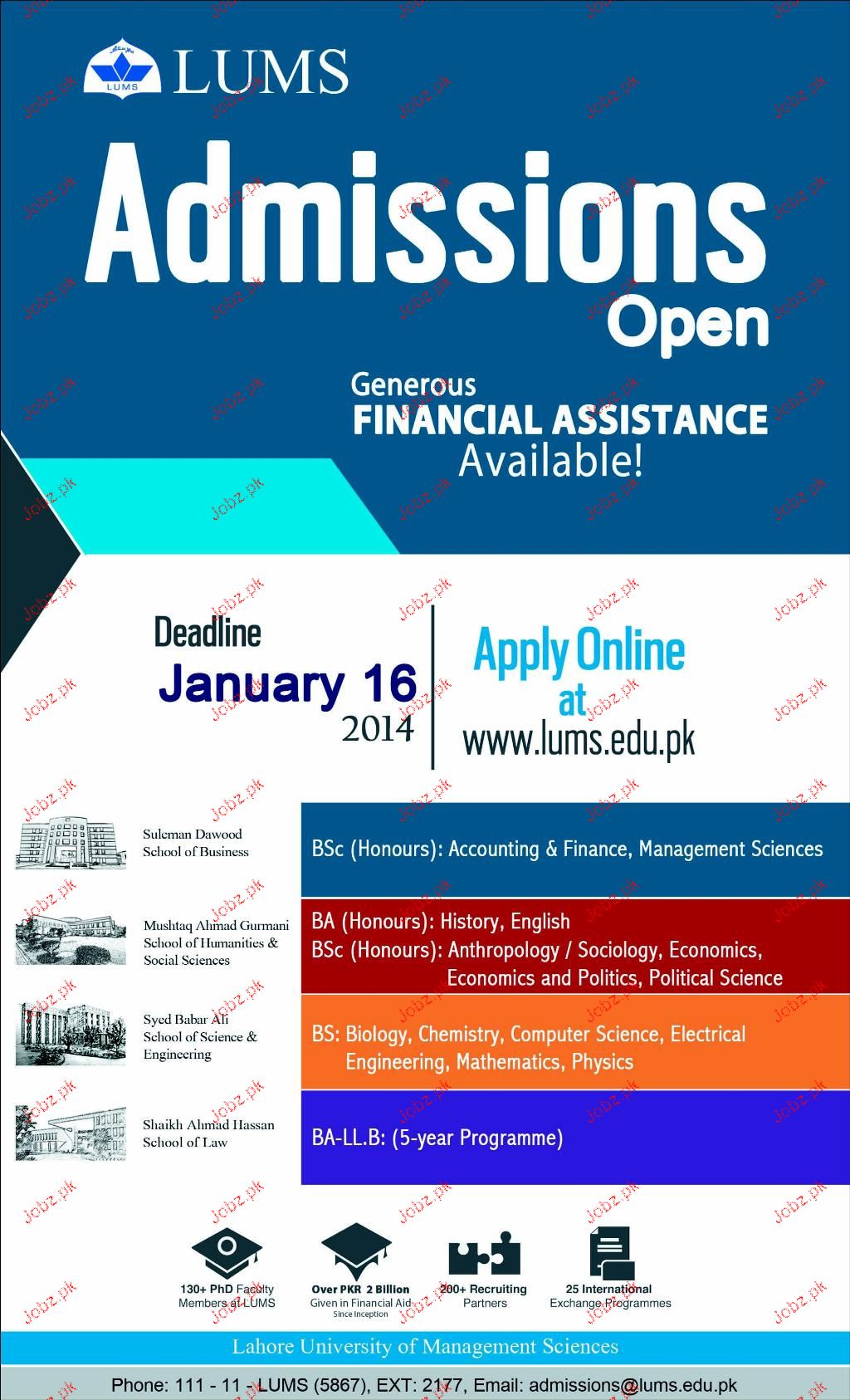 Lahore University of Management Sciences Admission in BSC, BA and LLB in Lahore Read newspaper ad for exact details.
