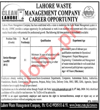 Vacancies in Lahore Waste Management Company Advertisement June 2020