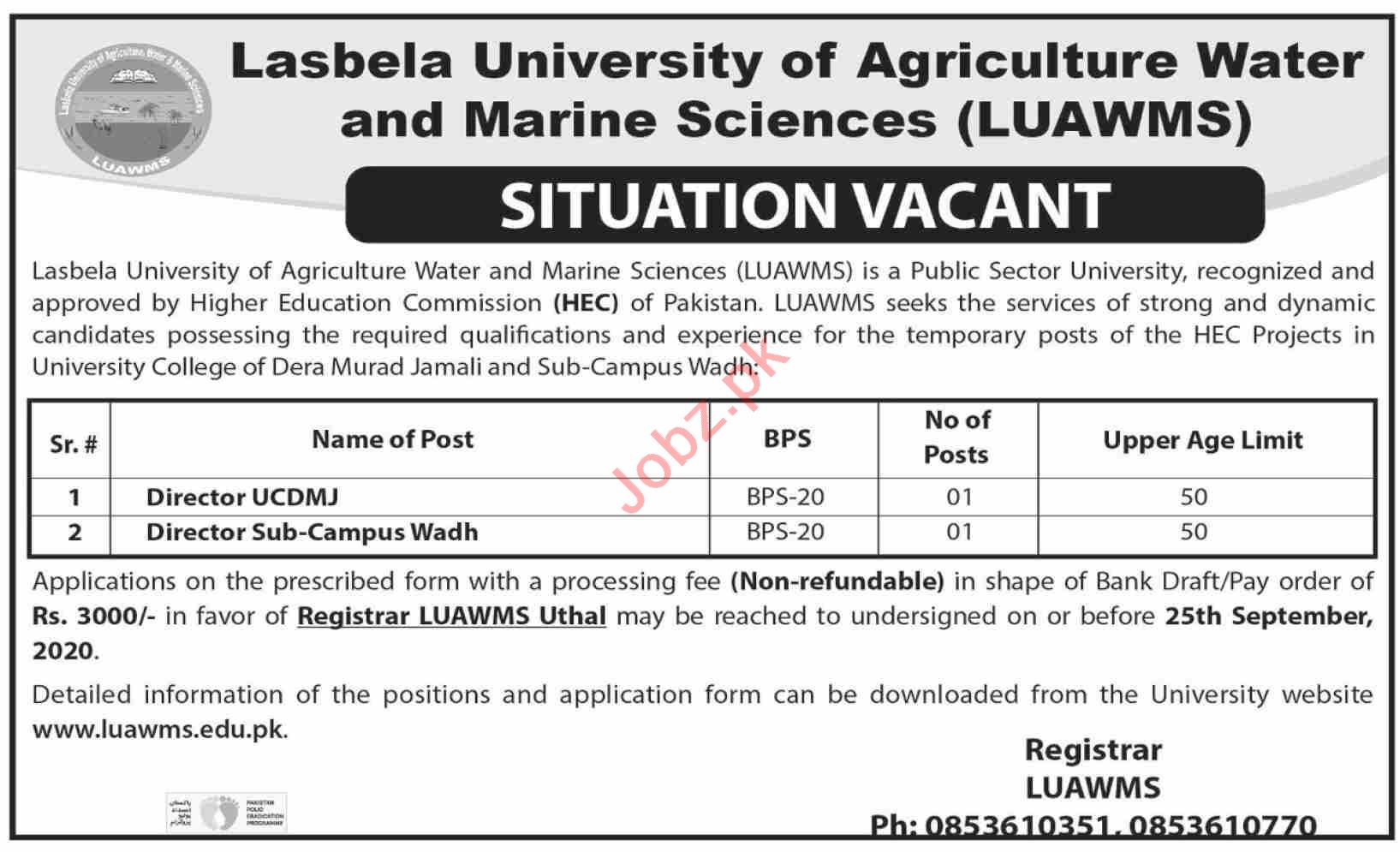Vacancies in Lasbela University of Agriculture Water and Marine Sciences Advertisement August 2020