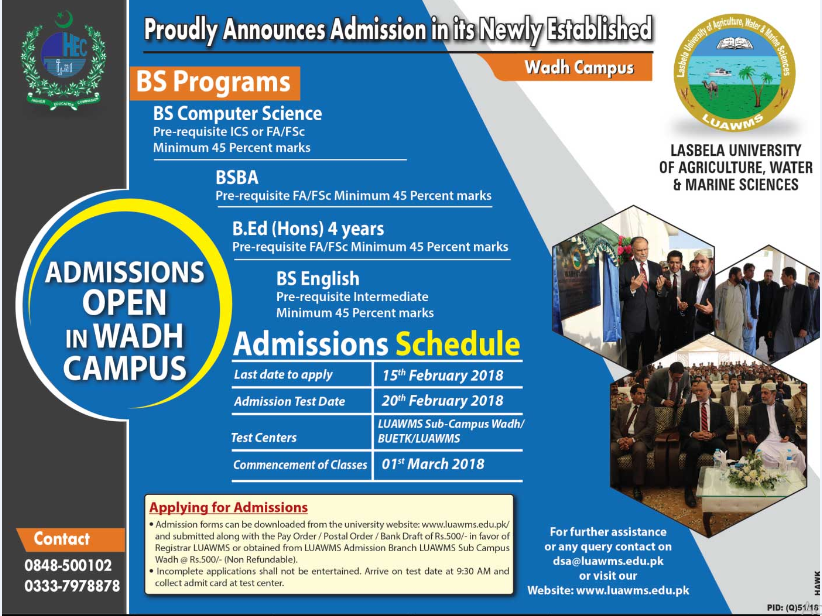 Lasbela University of Agriculture & Marine Sciences Admission in BS Program in Computer Sciences, BSA, B.Ed Honors Four Year Program and BS English in Lasbela. Read newspaper ad for exact details.