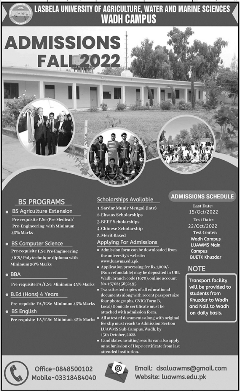 Lasbela University of Agriculture Water and Marine Sciences Bachelor in Agriculture Extension, Computer Science, Business Administration, Bachelor of Education, English. admissions 2022 has been announced. Students who want to take admissions in Lasbela University of Agriculture Water and Marine Sciences Khuzdar Balochistan Pakistan for academic year 2022 to continue education in Teaching University can apply. Eligible students for fulfilling criteria for admissions in BS and Bachelor can enroll as per Private admission policy 2022 till closing date 15 October 2022. Read newspaper ad for exact details.