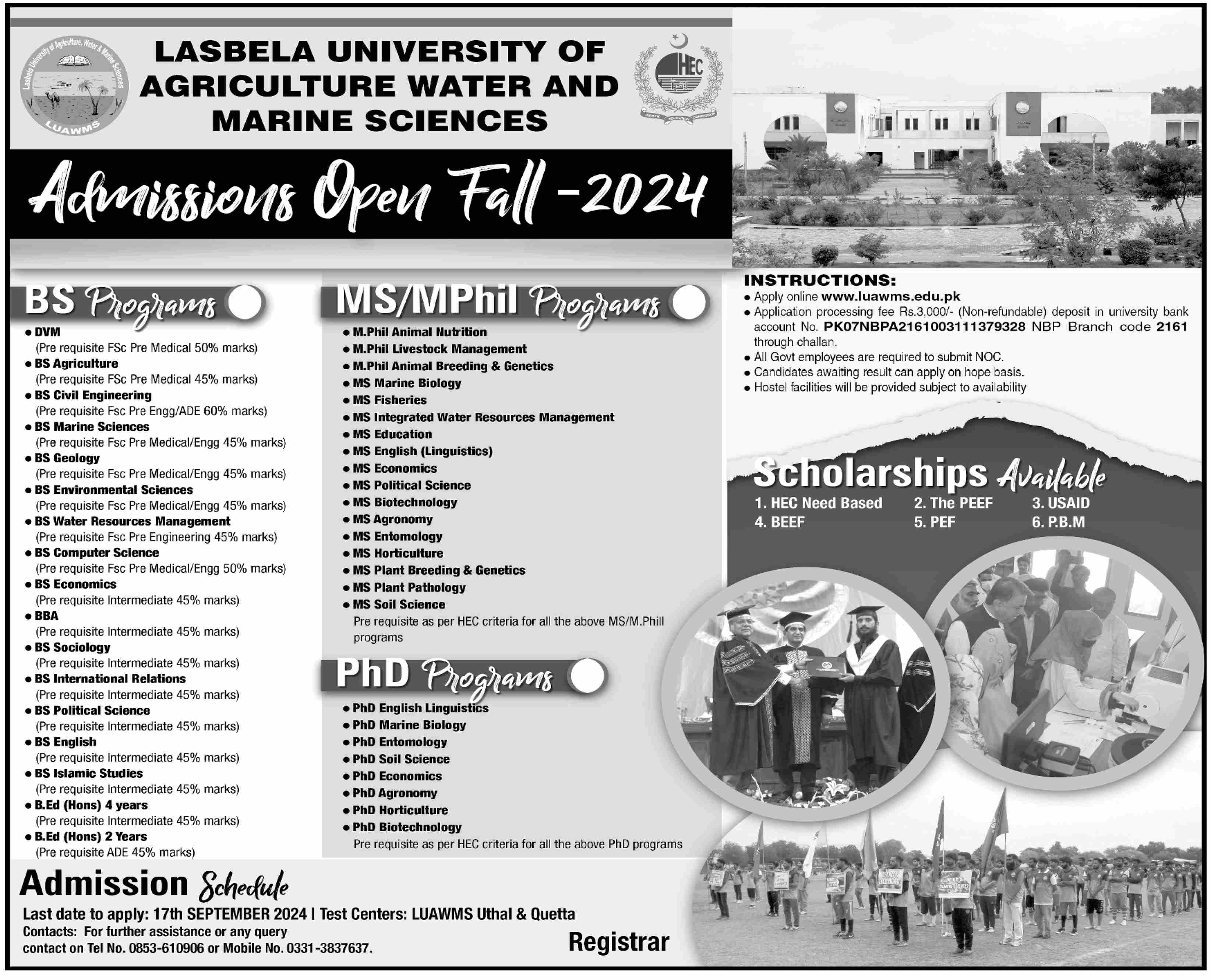 Lasbela University of Agriculture Water and Marine Sciences admissions 2024 for Agriculture, Civil Engineering, Marine Sciences, Geology, Environmental Sciences, Biotechnology, Agronomy has been announced. Eligible students can apply for academic admissions 2024 in Lasbela University of Agriculture Water and Marine Sciences Lasbela Balochistan Pakistan for Teaching University. Eligible students for fulfilling criteria for admissions in BBA, MS, DVM, BS, B.ed, Mphil and Phd can enroll as per Government admission policy 2024 till closing date 17 September 2024. Read newspaper ad for exact details.