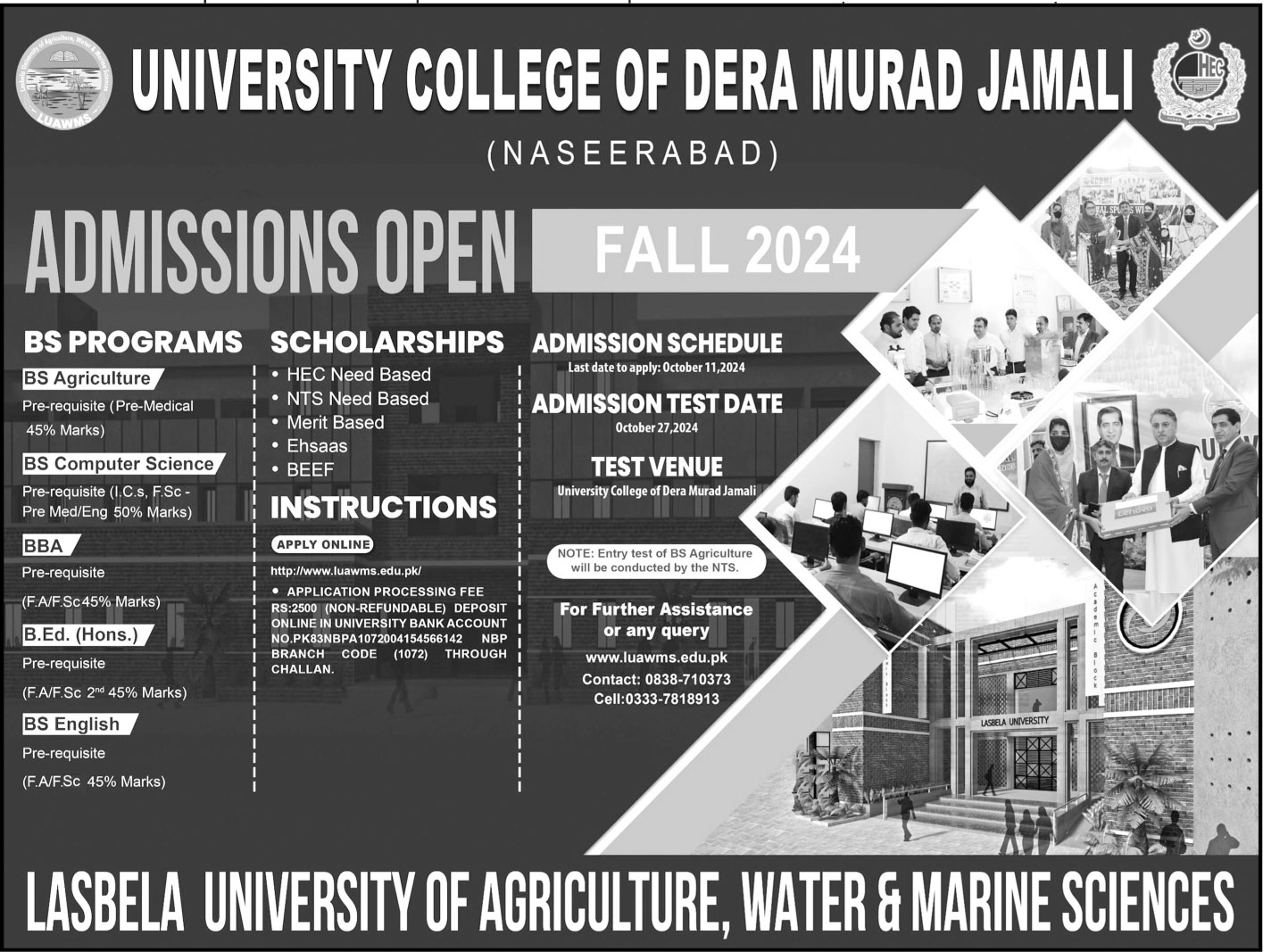 Lasbela University of Agriculture Water and Marine Sciences admissions 2024 for BS Agriculture, BS Computer Science, BS English has been announced. Students who want to take admissions in Lasbela University of Agriculture Water and Marine Sciences Lasbela Balochistan Pakistan for academic year 2024 to continue education in Teaching University can apply. Students who want to enroll for academic session 2024 in BBA, B.ed and BS qualification and admission criteria for Government institute can apply till last date 11 October 2024. Read newspaper ad for exact details.