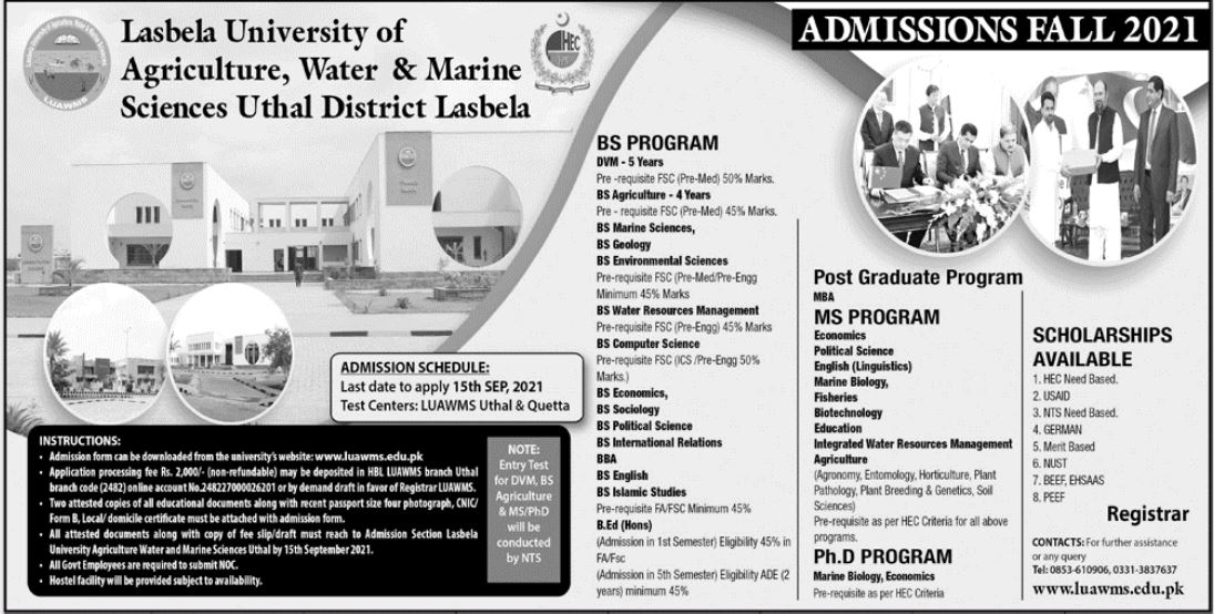 Lasbela University of Agriculture Water & Marine Sciences is a public sector university is offering online admissions in BS Program, Post Graduate Program and PhD Program 2021. Read newspaper ad for exact details.