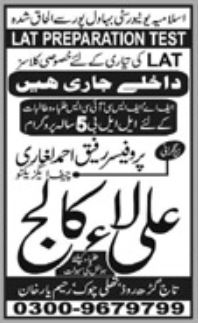 Ali Law College lat admissions 2025 has been started. Ali Law College Rahim Yar Khan Punjab Pakistan welcomes students to apply for admissions in academic year 2025 in Science College. Students for admissions in can apply for online or campus classes as per Government institute criteria till admission closing date. Read newspaper ad for exact details.