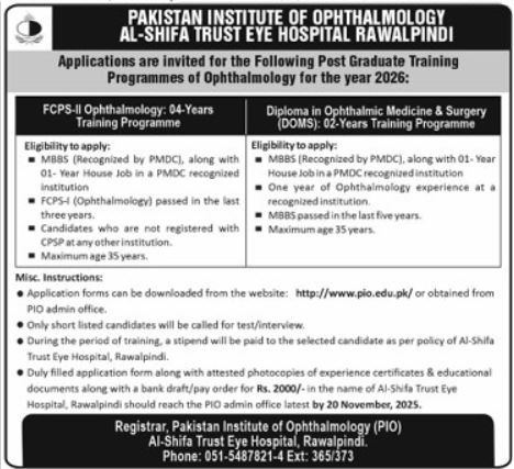 Al Shifa Trust Eye Hospital latest Private Medical jobs and others can be applied till 20 November 2025 or as per closing date in newspaper ad. Read complete ad online to know how to apply on latest Al Shifa Trust Eye Hospital job opportunities.