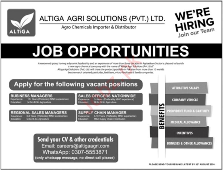 Altiga Agri Solutions Private Limted invites applications for job positions advertised in daily Jang dated 4 August 2024 for following vacancies in Quetta, quetta Balochistan Pakistan.