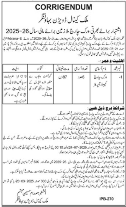 Anhar Department Bahawalnagar, bahawalnagar Punjab Pakistan invites applications from eligible candidates for the post of workcharge computer operator as per advertisement of July 14, 2025 published in daily Daily Pakistan Newspaper. Intermediate etc. educational qualification will be preferred.